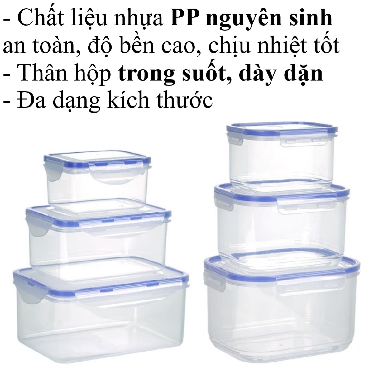 - Chất liệu nhựa nguyên sinh an toàn, độ bền cao, chịu nhiệt tốt (-20°C đến 120°C) phù hợp cho việc lưu trữ lạnh hoặc hâm nóng trong lò vi sóng.
