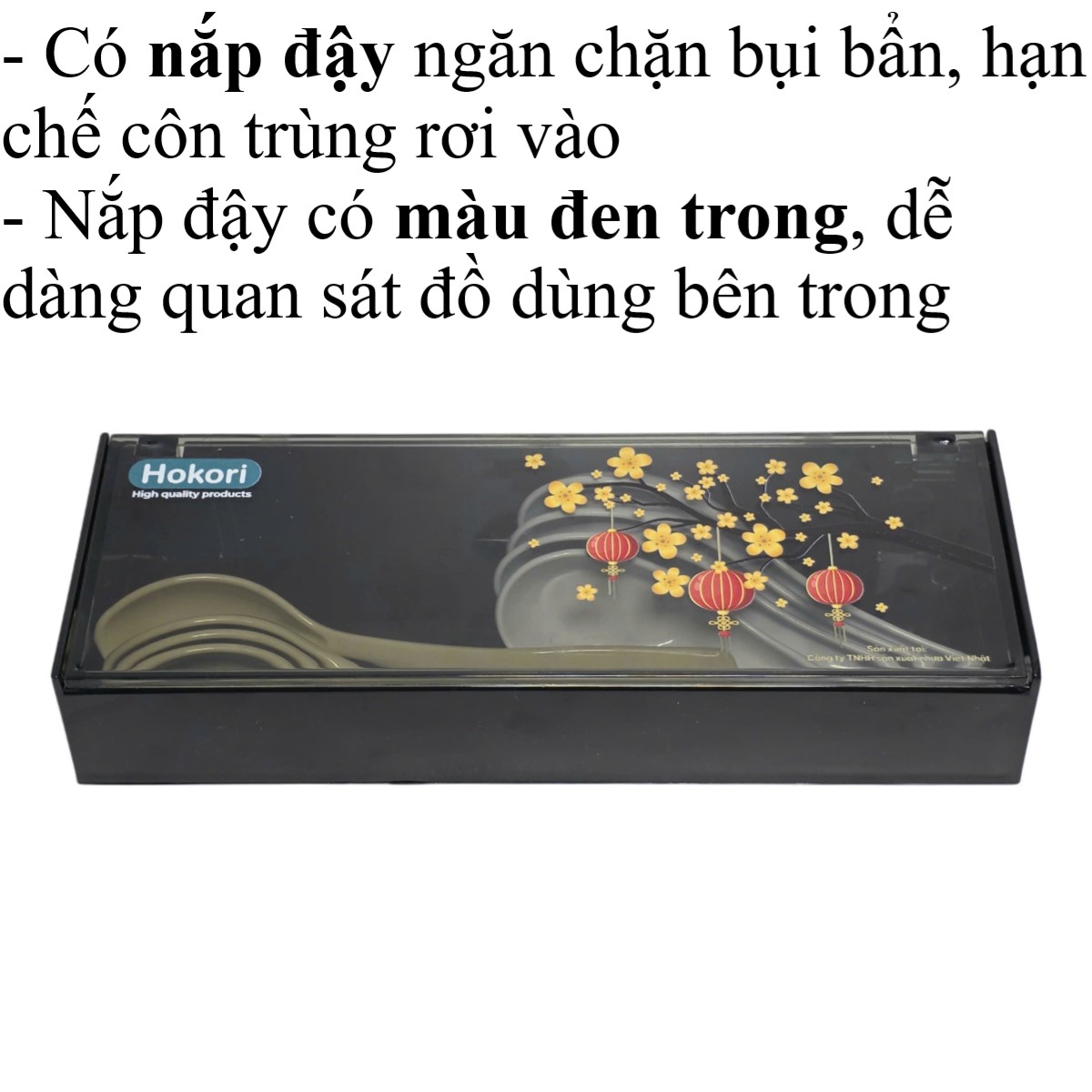 - Nắp đậy có màu đen trong, đễ dàng quan sát đồ dùng bên trong