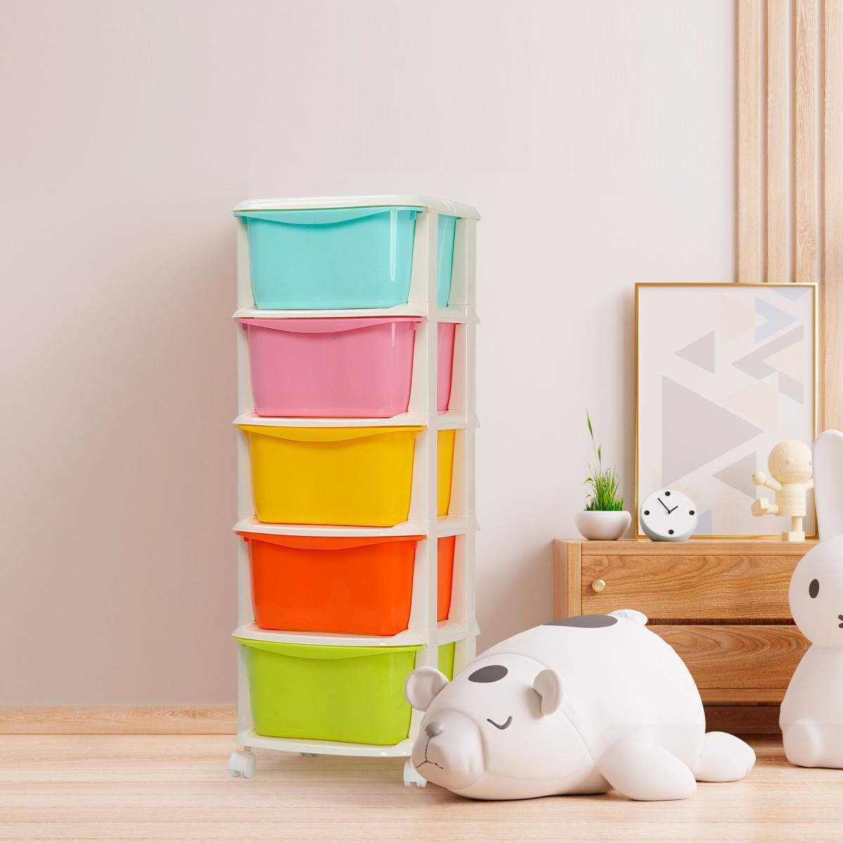 - Thiết kế 5 tầng với 5 màu sắc riêng biệt giúp dễ dàng phân loại đồ dùng, tiết kiệm không gian.